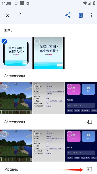 2、找到你想要隐藏的图片后,用手指长按它,然后点击界面右下角那个看起来像文件夹的图标。
