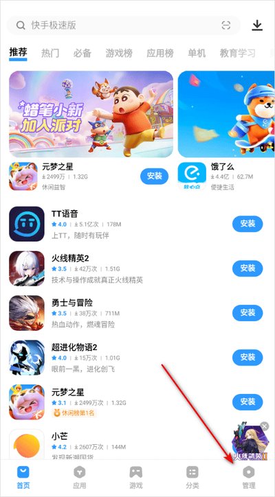 2、进入应用商店后,点击屏幕右下方的“管理”标签页。