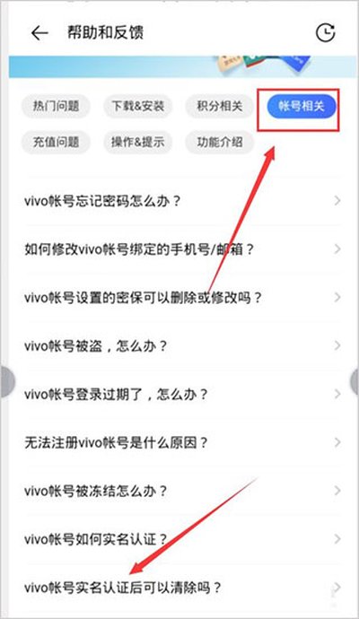 4、在“帮助和反馈”的分类中,先点击“账户相关”,再选择“实名认证清除问题”。