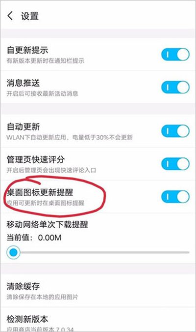 2、在设置菜单里,你会看到一个叫做“桌面图标更新提醒”的开关,把它关掉就行了。这样设置之后,即使有应用需要更新,桌面上也不会再出现角标提示了。