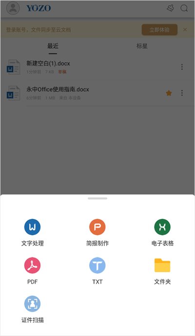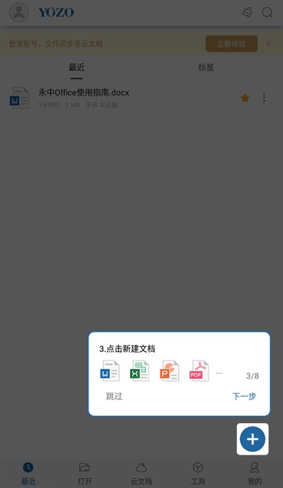 2、轻点界面右下角的加号图标,即可快速创建包括Word、Excel、PPT在内的多种格式新文件。