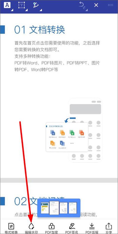 3、文件成功打开后,注意看屏幕下方的功能栏,这里有格式转换、分享、加密等多个按钮,点击其中的“编辑水印”功能。
