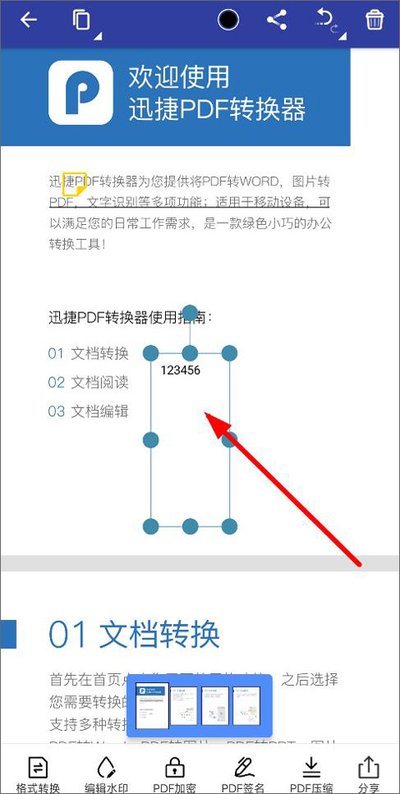 3、文件加载完毕后,你就进入了编辑视图。屏幕下方会显示一系列工具,比如字体样式、格式转换、编辑水印等。要开始编辑文字,你需要长按左上角中间的图标,把它切换到文字编辑模式。