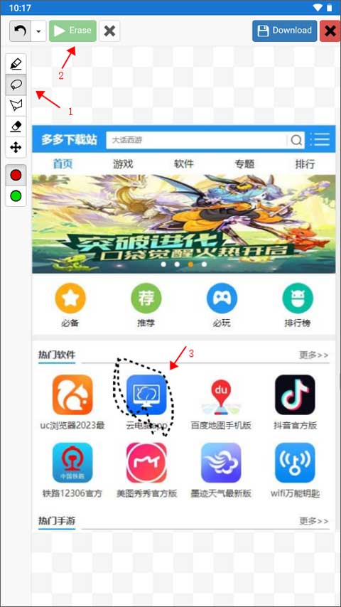 4、你需要先点击一下界面上方的“Erase”按钮,激活清除功能,之后才能在右边的图片区域开始圈选或涂抹你想要移除的部分。
