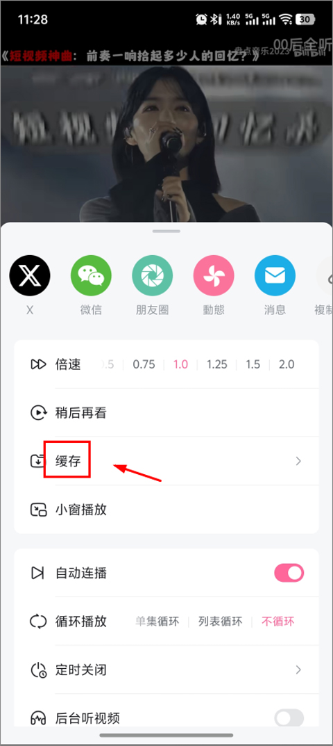 3、点击后,屏幕下方会弹出一个菜单。如果这个视频的创作者开放了下载权限,你就能在菜单中看到“缓存”这个选项,直接点击它,视频就会开始下载到你的设备中了。