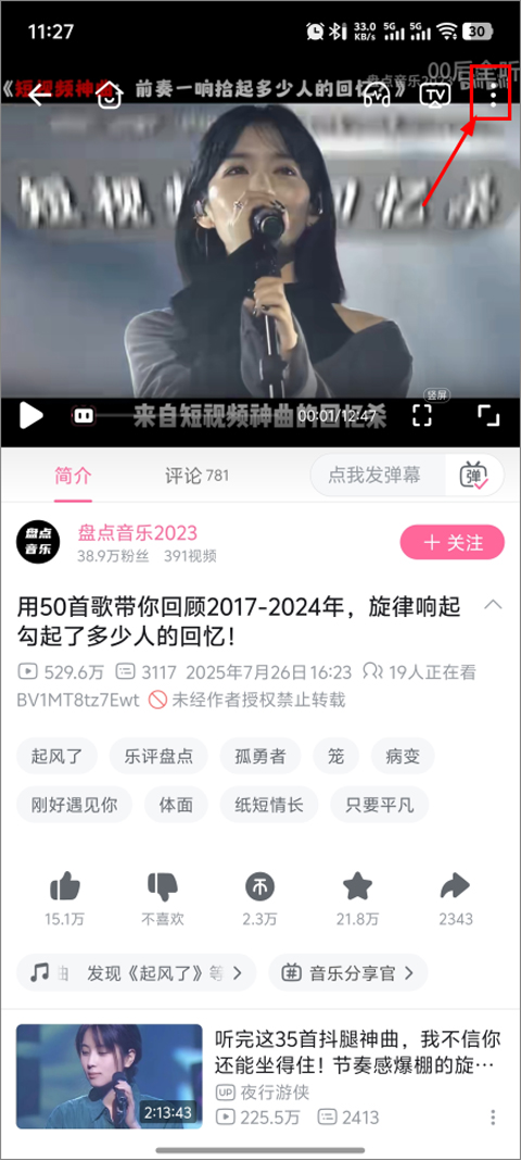 2、接着,你可以随意浏览并找到一个你感兴趣的视频,点击播放。进入到视频播放页面之后,请留意并点击界面右上角的三个小圆点图标。