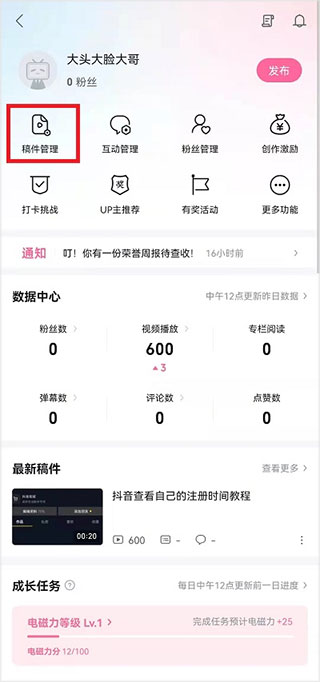 3、进入创作首页后,在页面的上方导航栏中找到并点击“稿件管理”,系统就会跳转到你所有已发布作品的列表页面。