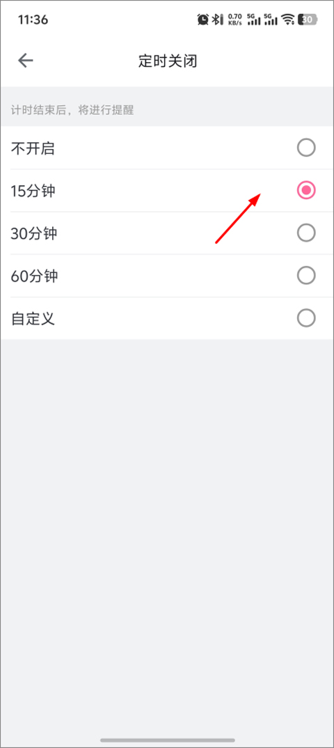 4、在这里,你可以根据自己的需要设定一个倒计时时长。比如,你可以选择让应用在15分钟后自动停止播放视频,作为示例我们就选择这个时间。