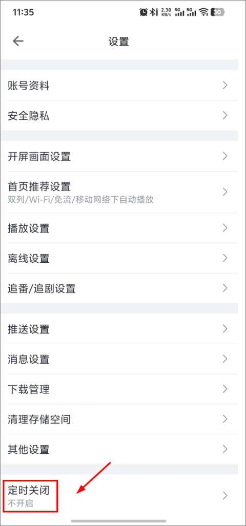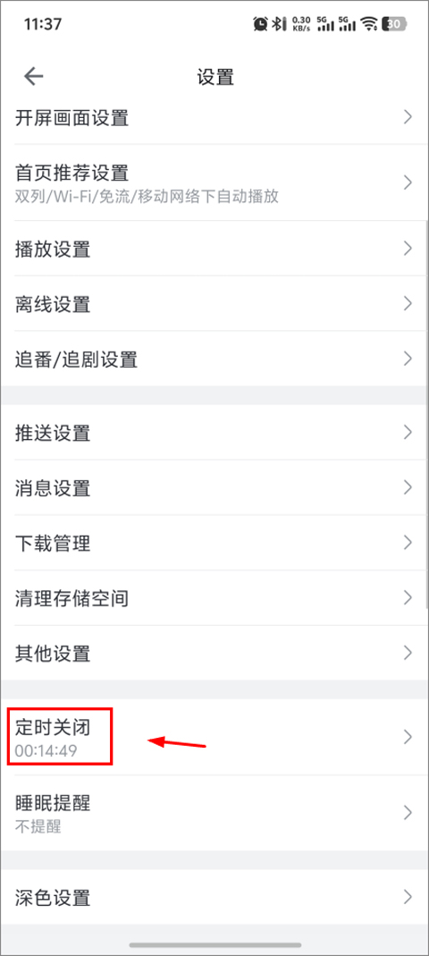 3、在设置菜单里,你会看到很多可供调整的选项,从中找到“定时关闭”这一项,然后点击进入它的专属设置界面。