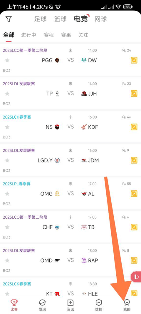 1、打开App之后,先别急着看比赛,在主界面的右下角找到“我的”这个选项,然后点一下进入个人中心。