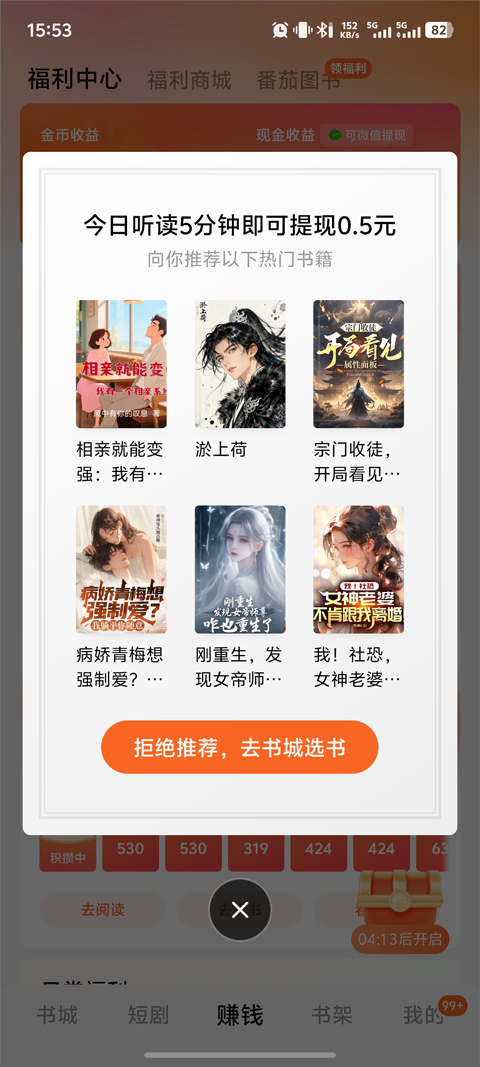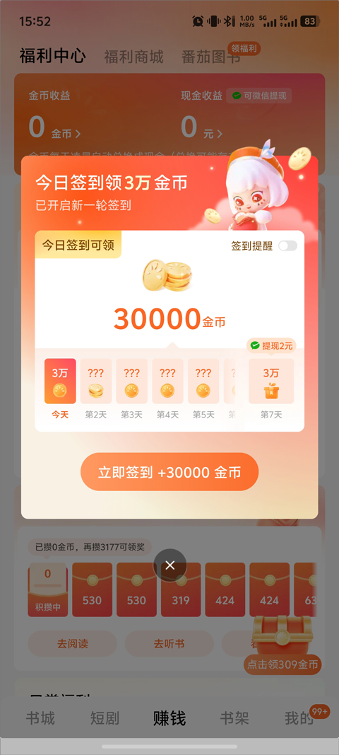 1、打开番茄小说App后,在主界面下方找到并点击“福利”这个版块。在这里,每天坚持签到就能领取金币,积攒到一万金币就可以兑换成一元现金哦。