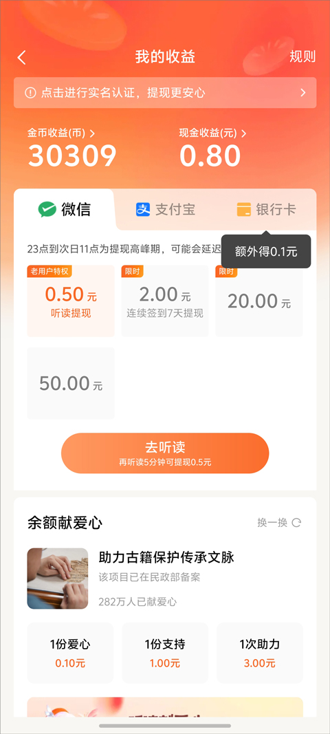 2、除了签到,每天花点时间听书或者阅读小说,同样也能获得金币奖励,让你的阅读时间更有价值。