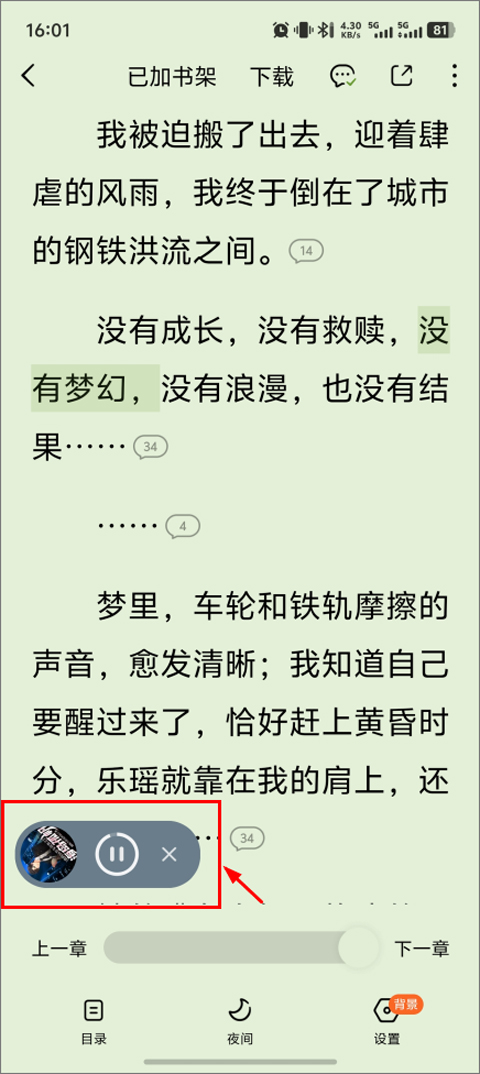 3、点击之后,App就会自动切换到听书模式,开始为你朗读小说内容了。