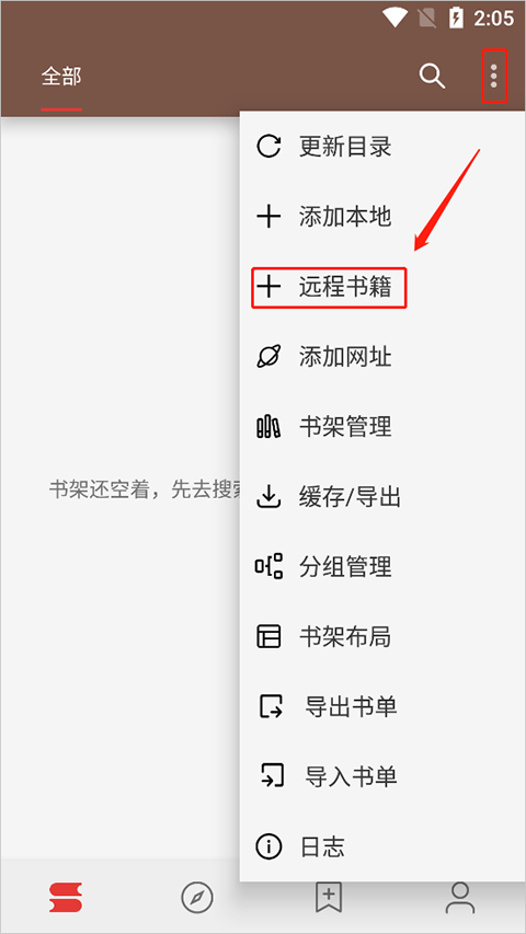 2、在主界面中,同样是找到并点击右上角的三个点菜单按钮,这次在弹出的选项里选择“远程书籍”。
