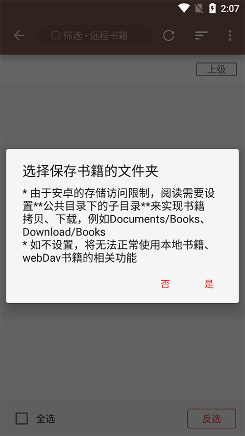 3、接下来,应用需要知道你的书籍文件存放在哪里,所以会让你指定一个文件夹作为书籍的来源目录。