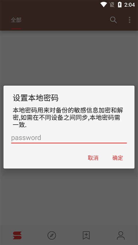 1、当你第一次启动应用时,系统可能会提示你设定一个本地密码来保护数据,按需设置后点击“确定”即可进入主界面。