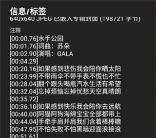 2、当然,还有另一种手动添加歌词的办法,就是利用歌曲的标签信息。同样是点击菜单按钮,选择【信息/标签】,然后把复制好的歌词粘贴到标签的相应位置,这样一来歌词也就能显示出来了。