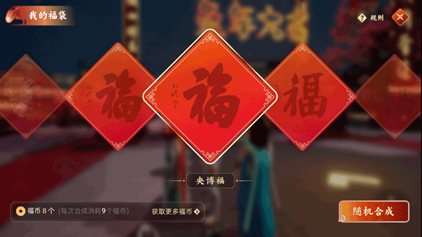 参加云庙会的各种互动,每项每天能让你得到8枚福币,算下来一天最多可以拿到96枚福币。只要点击屏幕右上角的福袋,每次花掉9枚福币,就能随机获得一枚由多位书法名家亲笔题写的电子福字,保存下来当手机壁纸再合适不过了!