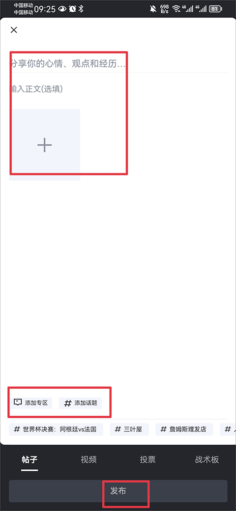 2、接着,在打开的编辑页面里输入你想分享的文字内容,写完后点击右上角的“发布”就大功告成了。如果你想让帖子出现在特定的圈子里,可以点击下方的“添加专区或话题”来进行选择。