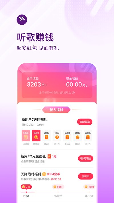 多元福利激励体系:内置听书/听歌赚金币机制,通过签到、开宝箱等任务积累奖励,新老用户均可获得红包并支持提现。