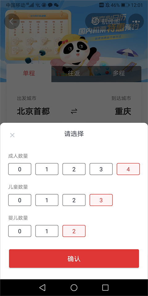当你在预订机票选择舱位的时候,可以通过调整数量来设定乘机人数。系统最多允许你选择4名成人、3名儿童和2名婴儿。