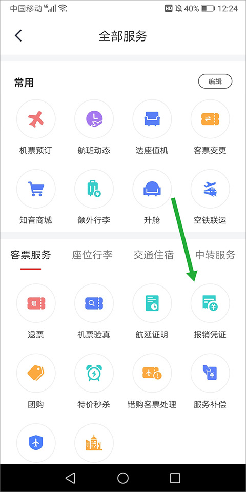 在展开的全部服务列表里,找到“报销凭证”这个选项,然后点击进入。