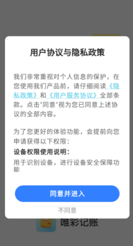 1、打开应用后,首先会看到用户协议和隐私政策,花点时间看看,没问题就点同意继续吧。