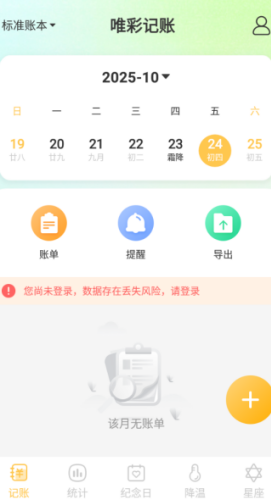 首次打开唯彩记账,同意用户协议和隐私政策,稍等片刻让应用准备好初始数据,一个清爽的主界面就会立刻展现在你眼前。想要开始你的第一笔记账?无需犹豫,直接点击屏幕中央那个醒目的“+”号,即刻开启你轻松便捷的记账之旅吧!