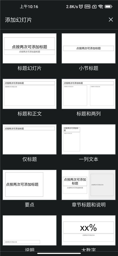 2、编辑好第一张幻灯片之后就可以新建第二张幻灯片了,在添加幻灯片页面选择自己需要的幻灯片样式即可添加。