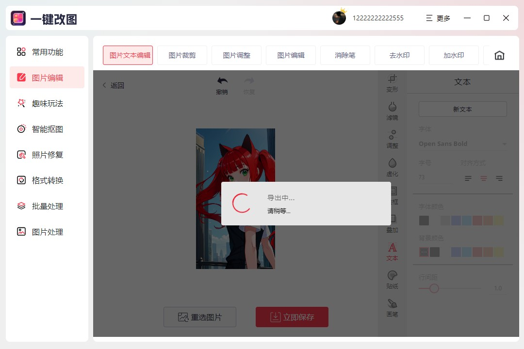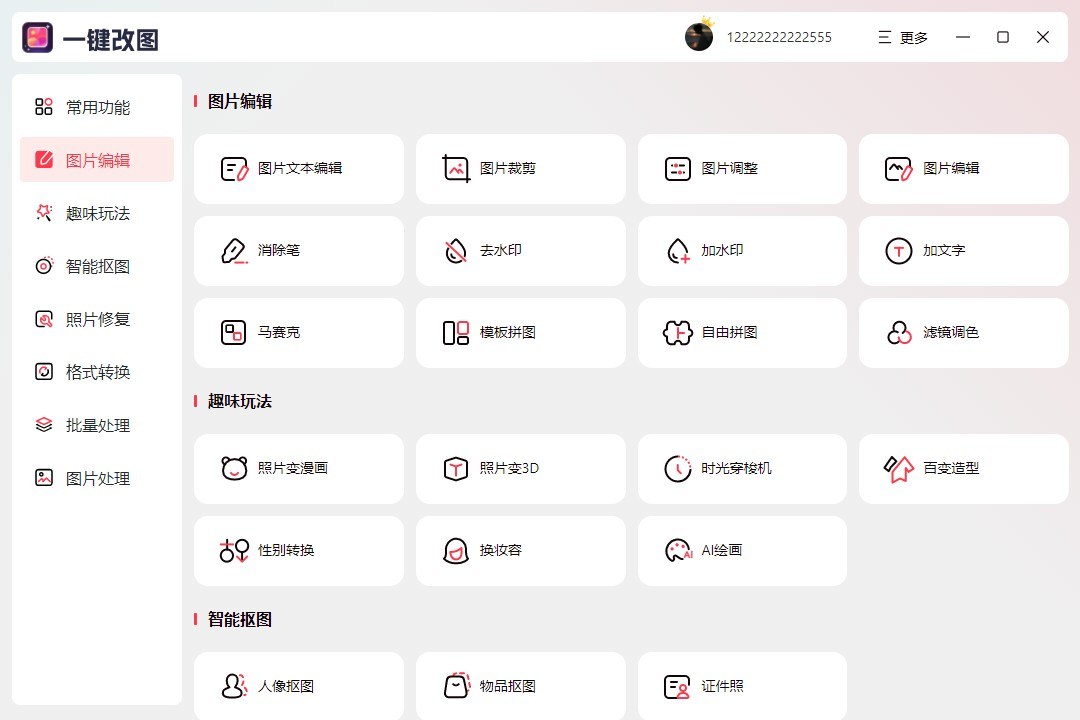 欢迎来到一键改图标准版!这是一款能让你轻松施展魔法的图片编辑神器。操作界面清爽直观,只需点击“图片编辑”并上传你的照片,就能开启创作之旅。我们为你准备了海量实用工具,无论是想一键变换风格,还是精细调整细节,都能瞬间搞定,让你的每张照片都与众不同,快来下载体验吧!
