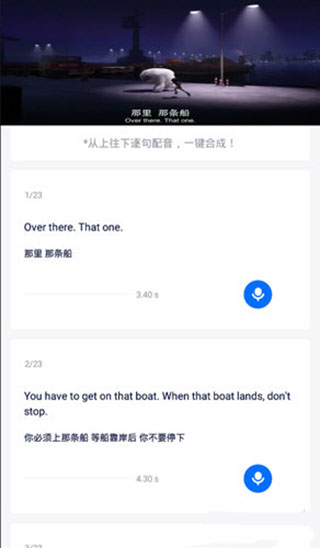 1、用户只要选择一个你想要合作配音的视频,然后根据台词段落点击录音按钮,就可以开始合配了。