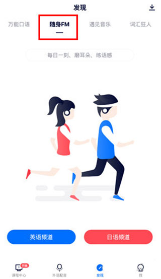 1、用户需要先进入到“发现”这个栏目,在里面的随身FM功能中,选择“英语频道”或者“日语频道”。
