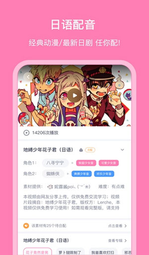 1、配音练习:你可以通过模仿动漫、日剧等作品里角色的台词来锻炼日语口语,一键替换掉原声,生成一个由你主演的全新视频,并分享给朋友们。