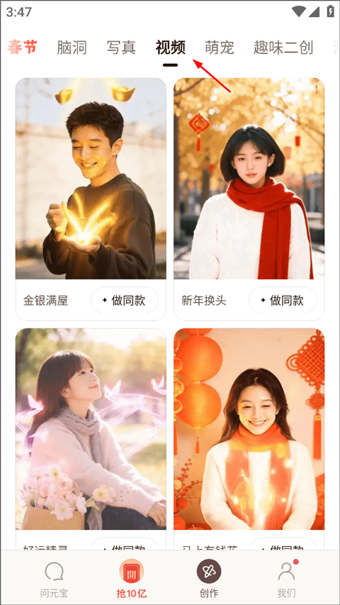 1、打开元宝APP,点击底部「创作」,选择「视频」。