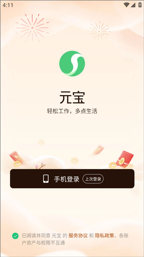 1、打开元宝APP,使用手机号完成注册并登录。
