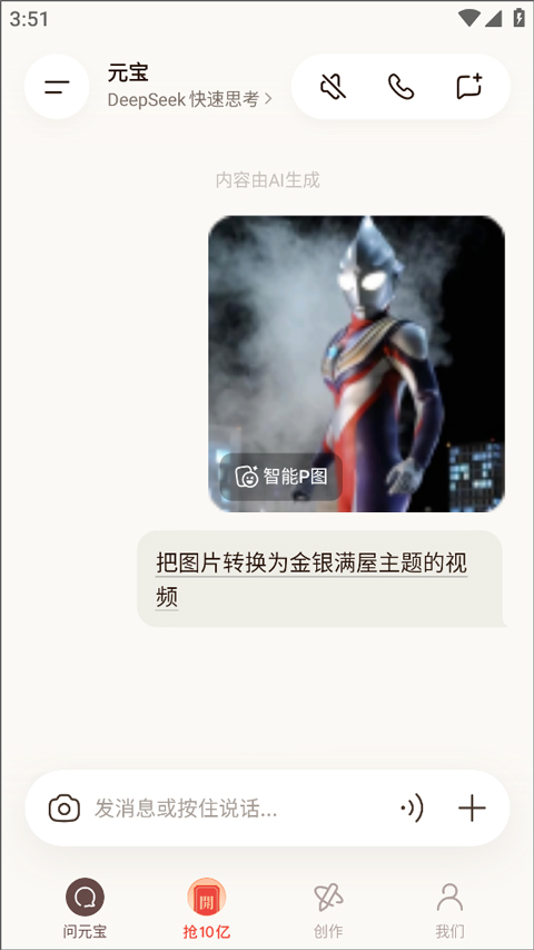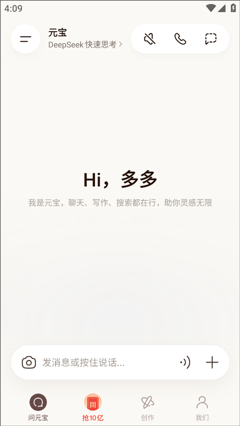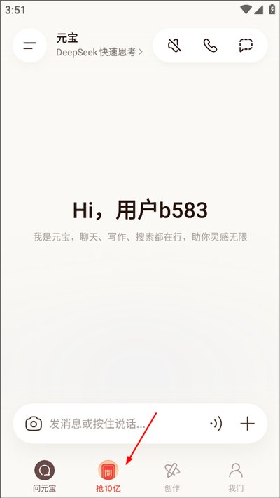1、打开腾讯元宝APP,进入首页点击「抢10亿」活动入口。