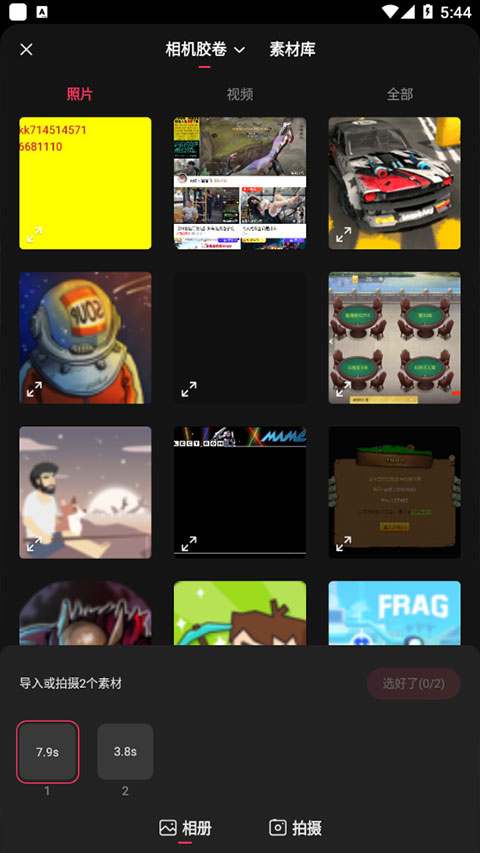 2、程序会跳转到你的手机相册,在这里挑选你想用的视频或图片,可以一次勾选多个素材,选完后点击确认。