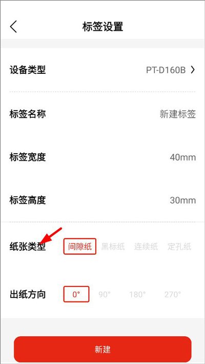 2、接着会跳转到标签的设置页面。在这里,你需要先选好对应的打印机型号,给你的标签起个名字,再设定好宽度和高度,然后找到并点击“纸张类型”这个选项。