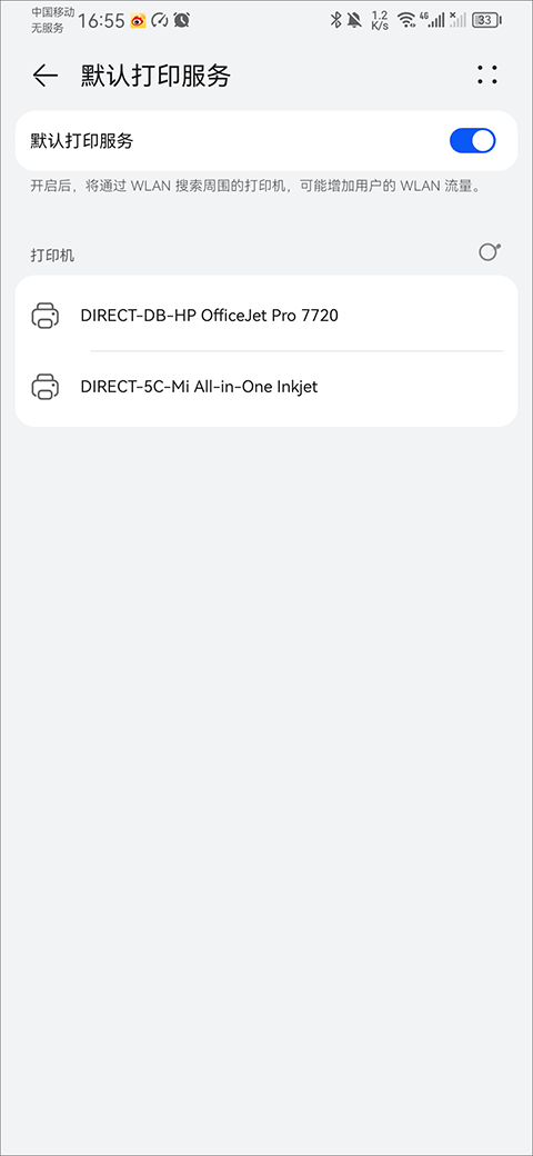 3、当您启用系统的默认打印服务后,手机就会开始自动在网络中寻找可用的打印机。稍等片刻,在搜到的设备列表里找到你的那台打印机,点击它的名字就可以完成连接了。