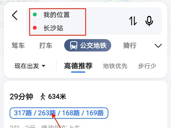 2、接着,输入你的出发地和目的地,然后从给出的方案中选择一种你想要的出行方式。