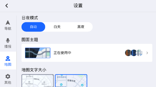 6、在地图设置里,你可以调整日间或夜间模式、地图上字体的大小,还能选择一个有个性的汽车图标。