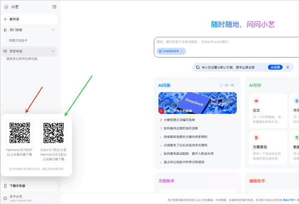 1.虽然完整的语音交互功能是为华为设备量身定做的,但小艺强大的AI能力并没有完全将其他品牌手机的用户拒之门外。对于那些在学习、工作或娱乐方面需要AI帮助的朋友,完全可以通过访问华为小艺的官方网页版来解决问题。用户通过任意浏览器访问网址 `https://xiaoyi.huawei.com/chat/`,即可直接启用,并领略其在信息处理与内容创作领域的非凡实力。。