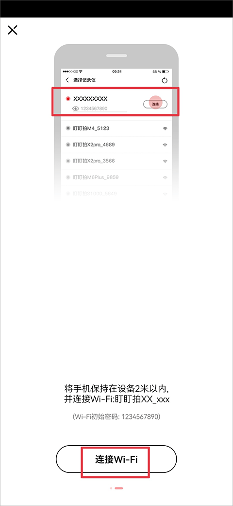 4、设备装好通电后,App会自动搜索附近的WiFi。你在手机的WiFi列表里,找到那个以“DDPAI”开头的WiFi信号,点它连接(默认密码是1234567890)。连上之后,切回盯盯拍App,就能正常用了。