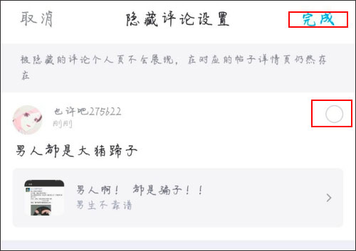 4、点击眼睛图标后,你就可以选择想要隐藏的具体评论了。只需在你不想被别人看到的评论旁边打上勾,全部选好之后,点击上方的“完成”按钮。