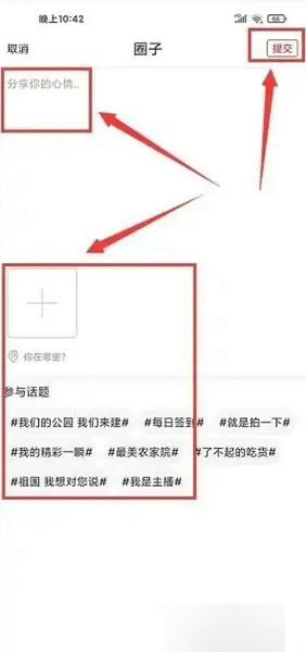 4.第四步,现在就进入了发布动态的编辑页面,你可以在这里输入想说的文字、上传照片、选择一个相关话题,全部完成后点击【提交】就行了。