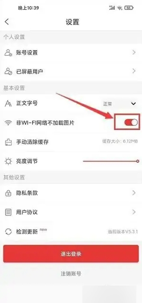 3.要完成该项设置,请进入设置页面,找到【非WI-FI网络不加载图片】这一项,并点击其右侧的开关。开关变为红色,就意味着该功能已经开启。。