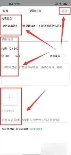4.最后,在添加内容的页面,你需要依次选择内容分类、填写标题、决定是否公开、输入爆料的具体内容、上传相关图片,并留下联系方式,确认无误后点击【提交】即可。