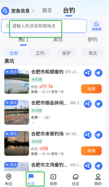 1、首先,在你的手机上打开路了个鱼应用,进入主界面后,找到并点击下方的“钓点”标签。在页面顶部的搜索栏里,直接打字输入你计划前往的那个钓场的名字进行精确查找。
