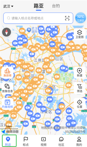 2、如果你还没有明确的目标,也可以切换到“附近”功能页面。应用会根据你当前的位置,为你展示周边一定范围内的所有可选钓鱼地点,方便你发现身边的好去处。
