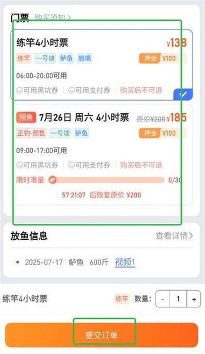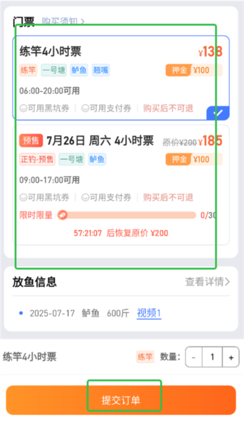 4、当你确认这就是你想去的钓场后,在该详情页面内找到购票入口,进入门票选择界面。根据你的需求(例如按天、按小时等)挑选合适的门票类型,然后点击屏幕下方的“提交订单”按钮。